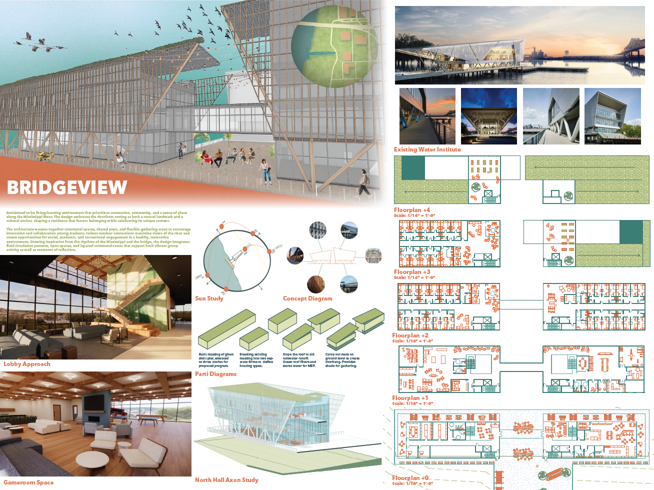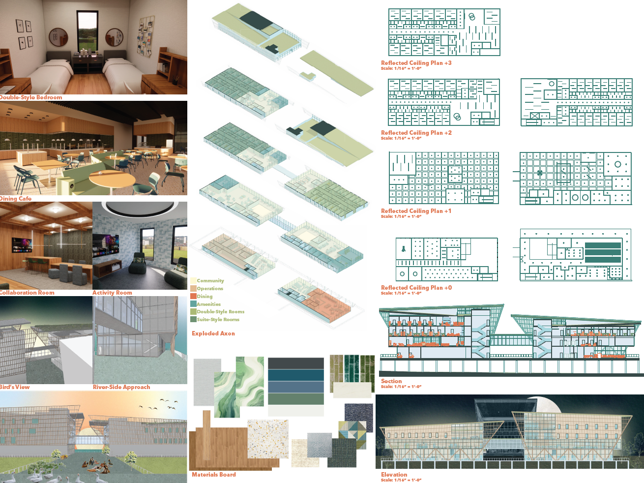 Envisioned to be living-learning environment that prioritizes connection, community, and a sense of place along the Mississippi River. The design embraces the riverfront setting as both a natural landmark and a cultural anchor, shaping a residence that fosters belonging while celebrating its unique context.